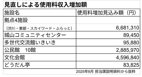 市の健康都市宣言に基づいて、筋トレや健康づくりに取組む地域組織は数多あり、その効果は高齢者の外出機会の創出、健康増進による医療費抑制やフレイル予防など、社会保障費抑制に効果を上げている可能性を否定できません。料金改定で見込まれる使用料収入の増加は左表の通り、総額で1400万円程度ですが、サークル活動がしぼんでいけば、それを取り戻すのは難しいことだと思います。